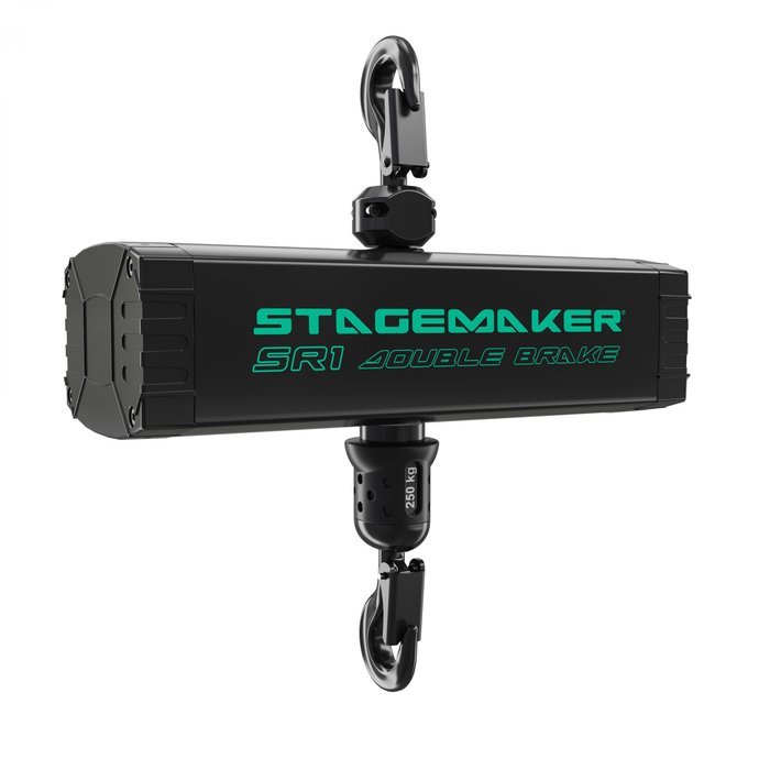Der STAGEMAKER SR1 ist die perfekte Lösung für Traglasten von 250 kg ( einsträngig ). Selbst mit zwei Bremsen kann er dank seines kompakten Designs (L 344 x B 153 x H 100 mm) problemlos in einen 30 cm quadratischen Aluminiumträger integriert werden. Damit verhindert er, dass oberhalb des Trägers Platz verloren geht, und verbessert gleichzeitig die Optik. Sein neues ergonomisches Design und seine schwarze Farbe sorgen dafür, dass er sich harmonisch in sein Umfeld einfügt. Darüber hinaus ist der Stagemaker SR1 mit beidseitig drehbarem Last haken ( Ausführung A ) sowie einer einstellbaren Rutschkupplung ausgestattet. Der Stagemaker SR1 ist ohne Umbau als Kettenzug oder Kletterzug einsetzbar. Der Geräuschpegel ist mit ca. 50dB sehr niedrig.